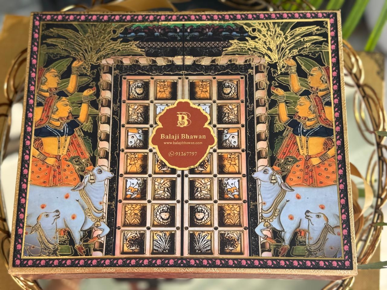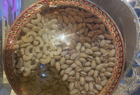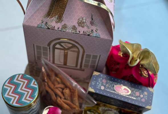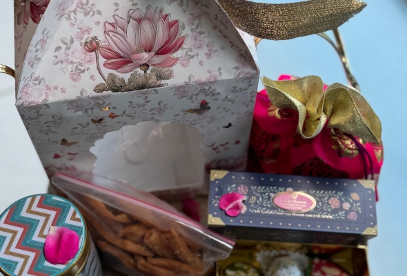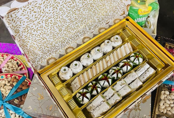 1 TIN OF MASALA CASHEW NUTS 1 POTLI OF SAVOURY 9 PCS SWEET BOX 1 TEA...